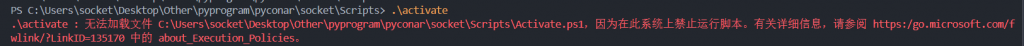 vscode 启动Python虚拟环境问题 2024-10-05 14:05 | 疑难杂症 | 182 | 2024-10-05 14:07 12 字 | 几秒读完 本文最后更新于543 天前,其中的信息可能已经过时,如有错误请发送邮件到2067965693@qq.com shell工作台运行:Set-ExecutionPolicy -Scope CurrentUser RemoteSigned