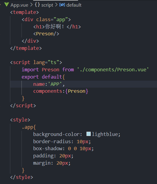看ts部分中的export default (指定模块默认导出) 、name 无所谓可随便取、components为组件注册