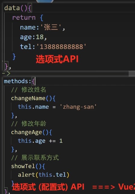 data()、methodes:{}等为optionsAPI