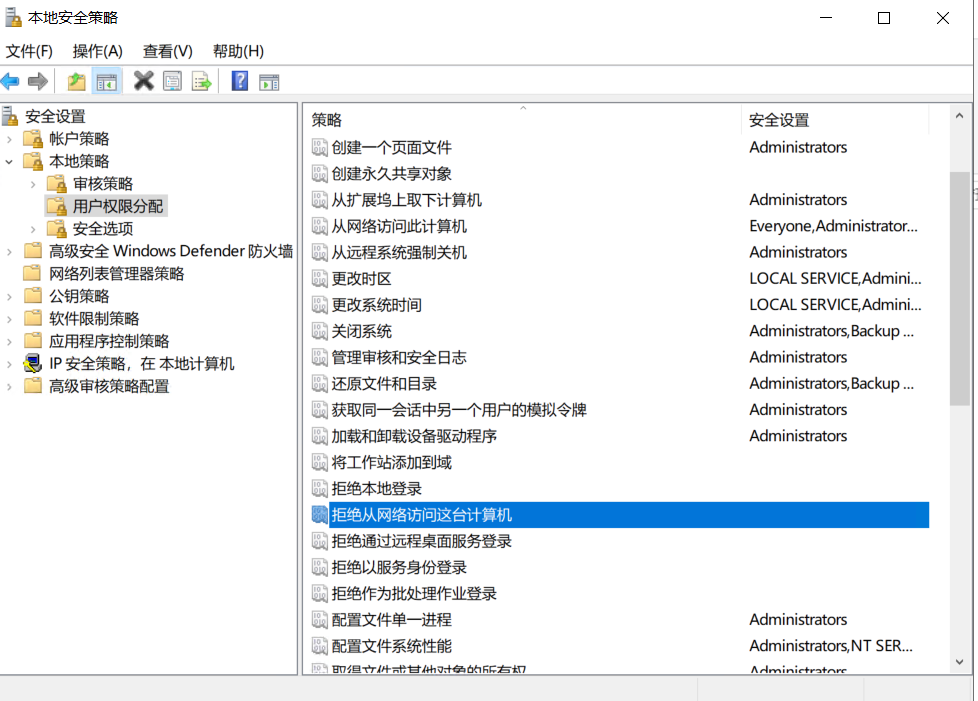 第一步:进入“控制面板-> 系统和安全-> 管理工具 -> 本地安全策略-> 本地策略-> 用户权限分配”,查找 “拒绝从网络访问这台计算机” ,右键-> 属性 -> 删除 Guest 即可【或者双击,然后删除 Guest】。