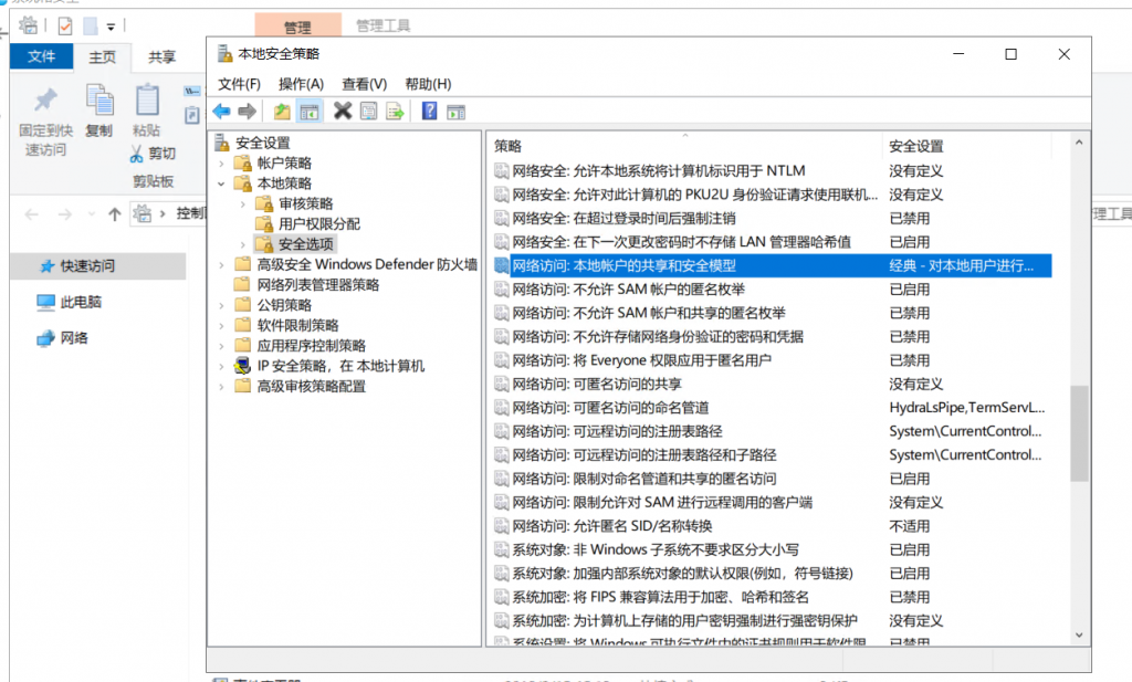 第二步:在“本地策略->安全选项” 中查找 “网络访问:本地账户的共享和模型”,选择经典。
