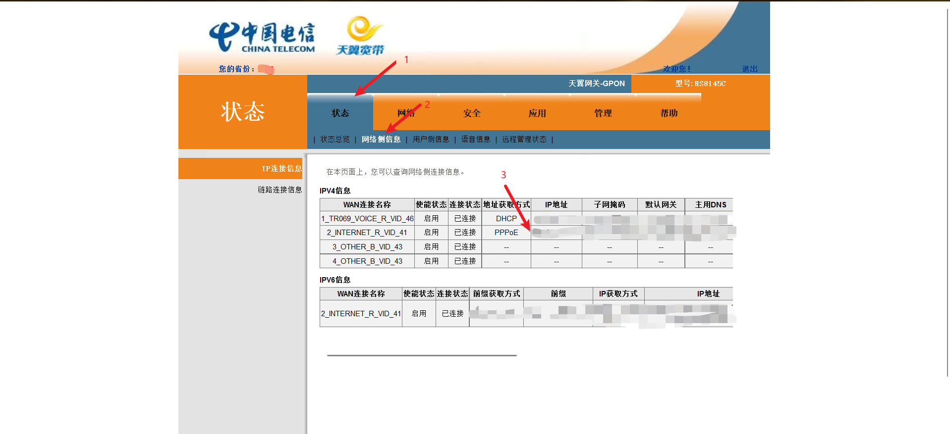 - 看到公网ip后打开你家的光猫后台(光猫背后的管理地址例如:192.168.1.1)
