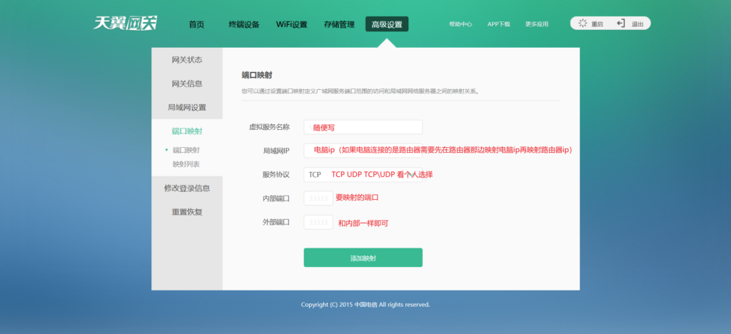 映射端口我们只需要进入光猫的管理地址,在高级设置里面找到端口映射